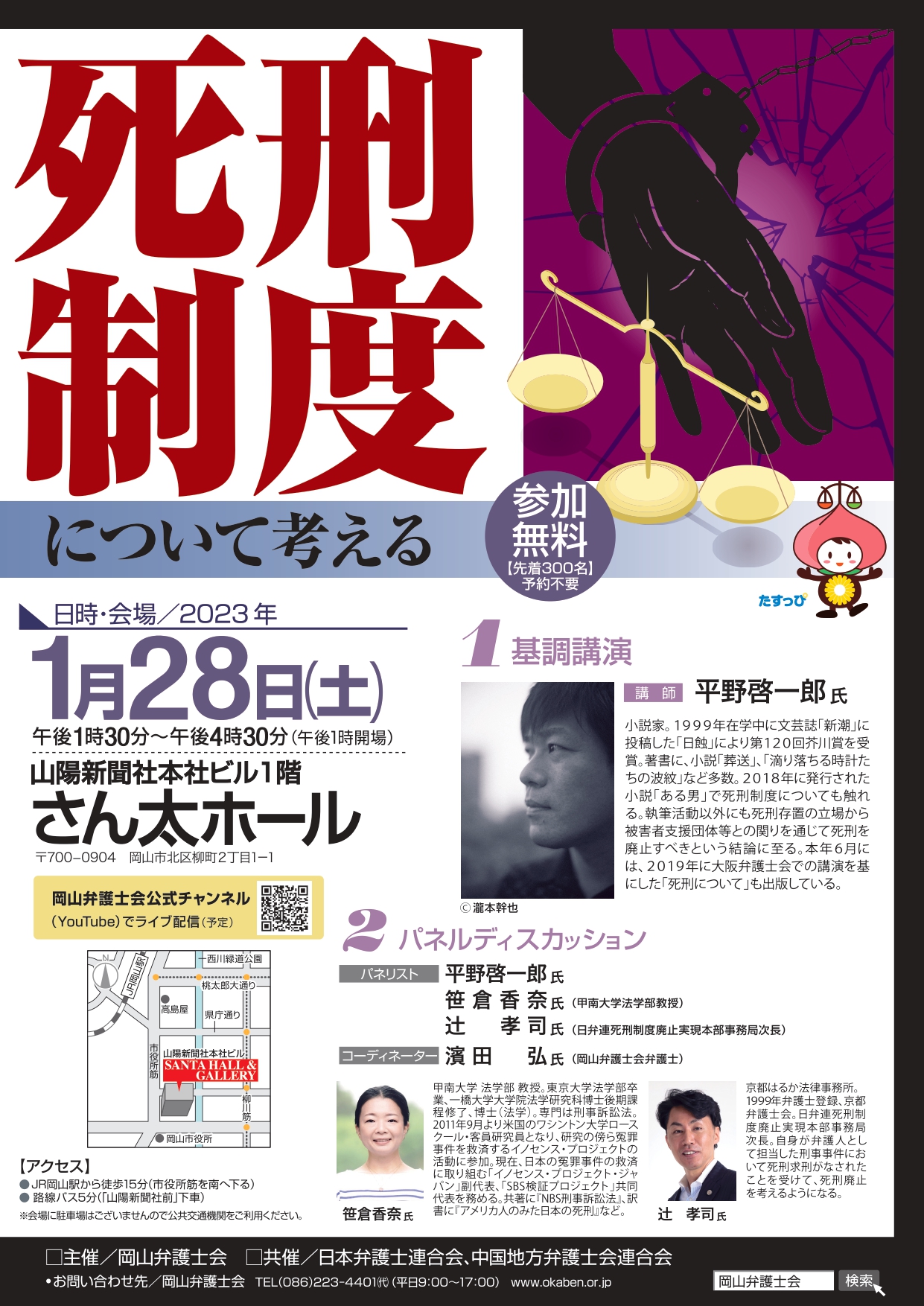 また、当日は、岡山弁護士会公式チャンネル(YouTube)でライブ配信も予定しておりますので、ご都合にあわせてご視聴いただければ幸いです。